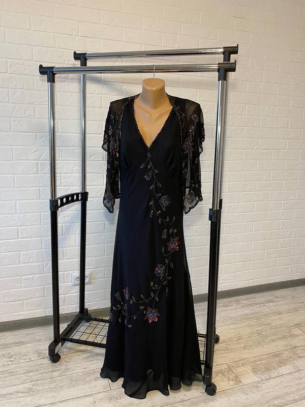 Вечернее длинное черное платье с вышивкой бисером, с накидкой