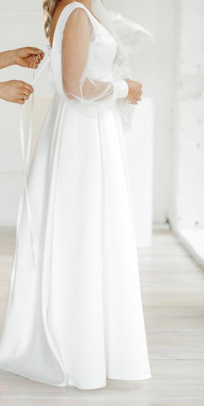Белое длинное платье. Затягивается зади шнурком для меньшего размера. Имеет карманы и разрез с одной из сторон Размеры: Высота- 148см + 5 см шлейф Талия - 38 см ( охват максимум 76) Рукав - 70см