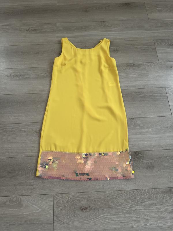 Великолепное коктейльное платье Ярко-желтого цвета, снизу пайетки Сзади есть завязка у шеи Крой - прямой Платье ни разу не одевалось Замеры: Длина 92 Груди 45 Талия 44 Бедра 48