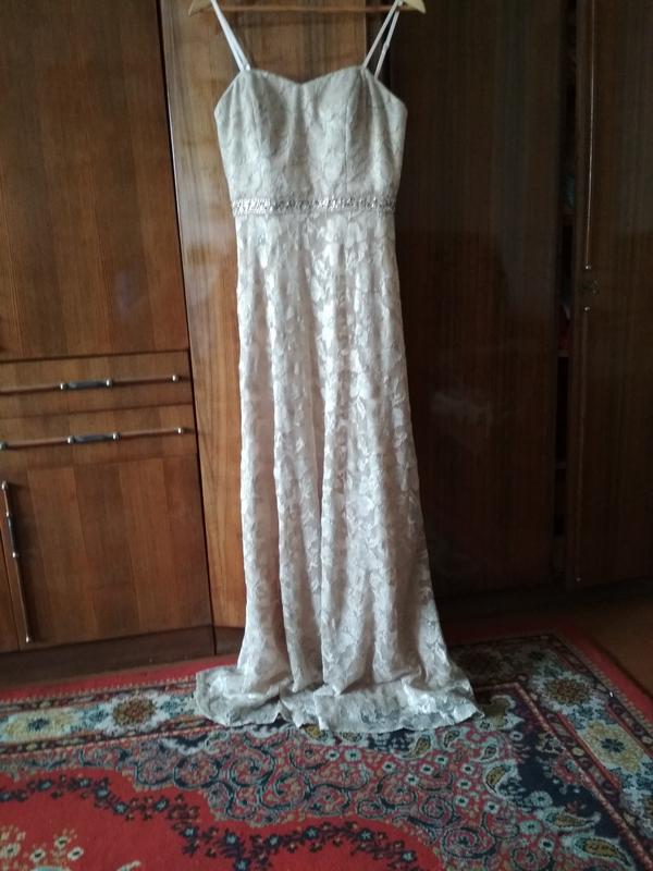 суперякісна нова фірмова вечірня сукня (придбана в салоні) бежевого з золотим кольору,на бретелях,які регулюються,тканина не тягнеться і не просвічує,є підкладка,застібається ззаду на блискавку і як бюстгалтер додатково.ПОГ-40 см,ПОТ-36 см,ПОБ-47 см,довжина сукні-145 см.