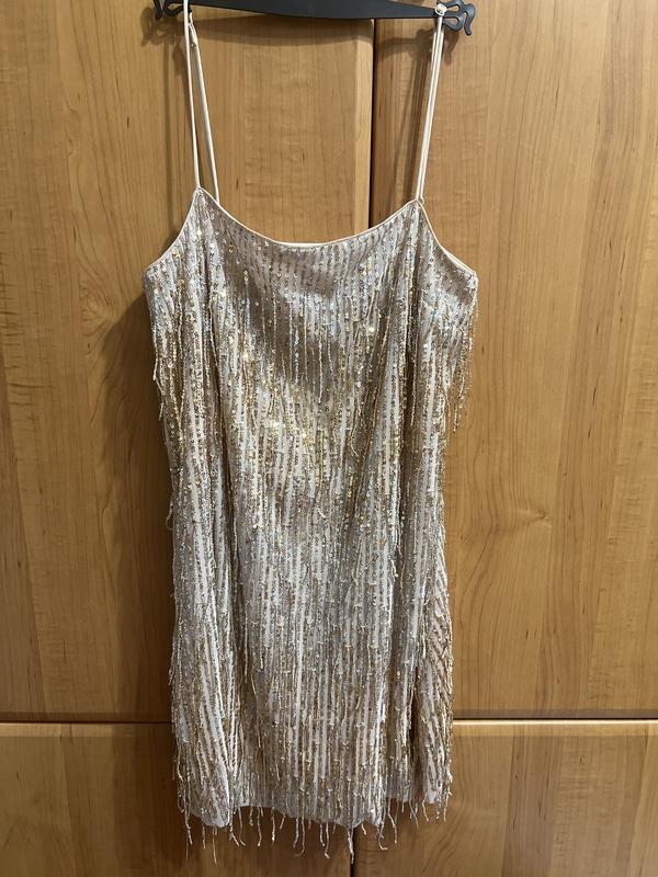 Платье- мини на бретельках, в пайетках, вечернее, с биркой!!! Цвет шампанского, платье красиво переливается, блестит при свете, на солнце