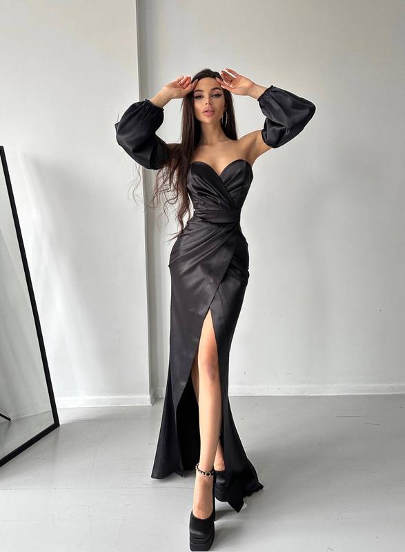 Атласное платье макси со шлейфом и разрезом от бедра, длинное платье с объемными рукавами,...