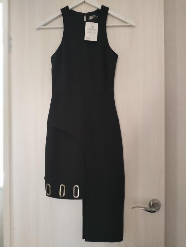Оригинальное платье небольшого размера. На боковом замке. Внизу отделка металлической фурнитурой. ПОГ 36, ПОТ 30, длина короткой части юбки 84, длинной части 102см.