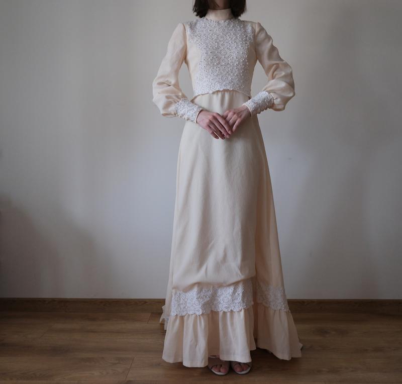 ПОСЛЕПЛАТЫ И БЕЗОПАСНОСТЬЮ ОПЛАТЫ НЕРАБОТАЕТ Винтажное вечернее платье с шлейфом ✨️Снаружи в идеальном состоянии, присутствуют недостатки внутри ✨️Размер не указан, на фото на XS, рост 170 см + каблуки (не по размеру, около XXS) ✨️Невероятное платье нежно-желтого цвета и плотным кружевом. Красивые манжеты и воротник, изящная и сказочная. Бирок с размером и составом нет, судя по всему индивиальному пошиву и без следов ношения. Снаружи тактильно напоминает жатую вискозу, а кружево на хлопок (воно необработано по краям), подкладка гладкая, похожая на вискоз или ацетат. Недостатки: в самом низу присутствуют небольшие отверстия и повреждения по кругу; внутри в одном месте присуща небольшая загрязнения между внешней тканью и подкладкой. Юбка платья не совсем правильно пошита, обратите внимание на фото 6 Параметры сняты внутри(с 1 по 4) 📎Полуобхват плеч - 34 см Полуобхват в груди - 38 см Полуобхват талии - 29 см Полуобхват бедер - до 44см Длина рукава - 60 см Длина - 36 см (до тали);от талии -100/165 см Перед заказом ознакомьтесь с разделом "Про меня"❗️ платье в стиле 19 века, историческое платье, театральное платье, свадебное платье, платье для фотосессий, платье со шлейфом, викторианское платье, платье для фотосессий
