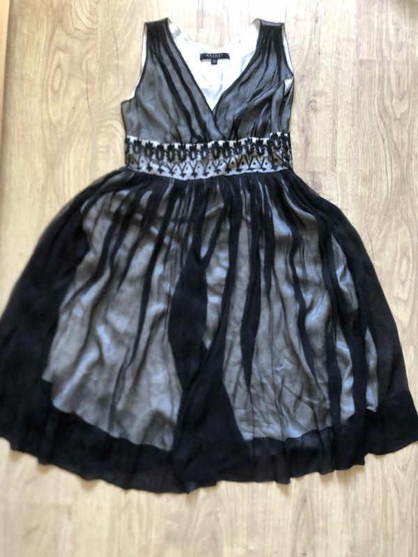 100% шовк, елегантна й витончена Платье с глубоким v-вырезом, отделанным поясом с черными и серебряными элементами, легкая многослойная юбка с прозрачным верхом. Идеальна для торжеств, фотосессий или особенных моментов. - 📏 Размер: 3 (ориентировочно S–M, уточни по замерам) - 🎨 Цвет: Черный с серебряными деталями - 🧵 Материал: - Верх: 100% шовк - Подкладка: 100% шелк - Отделка: 100% нейлон - 📌 Детали: - V-образный вырез - Без рукавов - Декоративный пояс - Прозрачная многослойная юбка - Бренд: NOUCAT - 📍 Состояние: В идеальном состоянии, без дефектов - 🧼 Уход: Ручная стирка, деликатный режим 💬 Платье смотрится очень элегантно – подходит к каблуку, клатчу, сердечкам. Продаю, потому что гардероб просит обновления 😉 Пог 47, длина 104 см