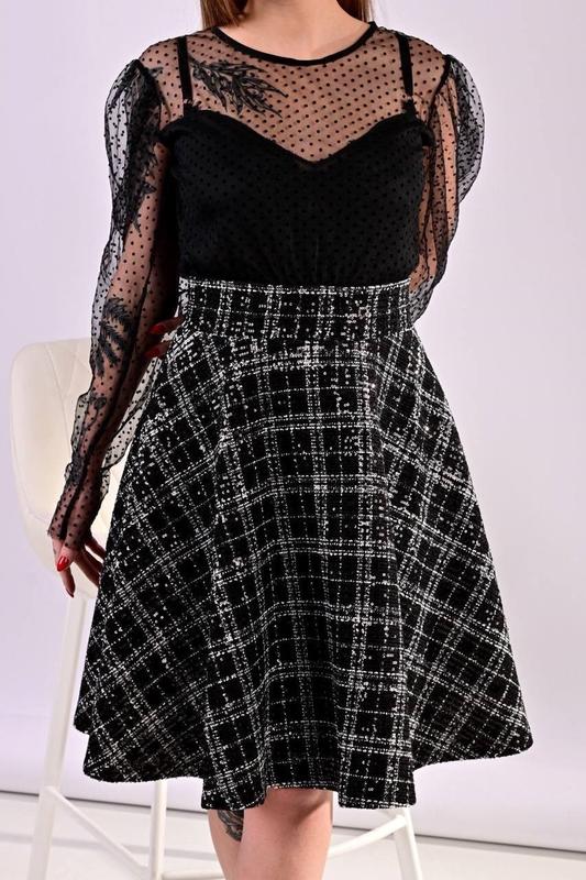Размер: M Состав: 100%полиэстер - верх из фатина, поверх украшен в бархатный горошек 65% шерсть, 35%акрил - юбка из плотного твидового материала, расшитого пайетками Замеры: в спокойном состоянии S плечи 38см Полуобхват груди 44см Полуобхват талии 34см Полуобхват бедер 68см свободно Длина 95 см Рукав 58см Замеры: в спокойном состоянии M плечи 40см Полуобхват груди 46см Полуобхват талии 37см Полуобхват бедер 72см свободно Длина 95 см Рукав 64см