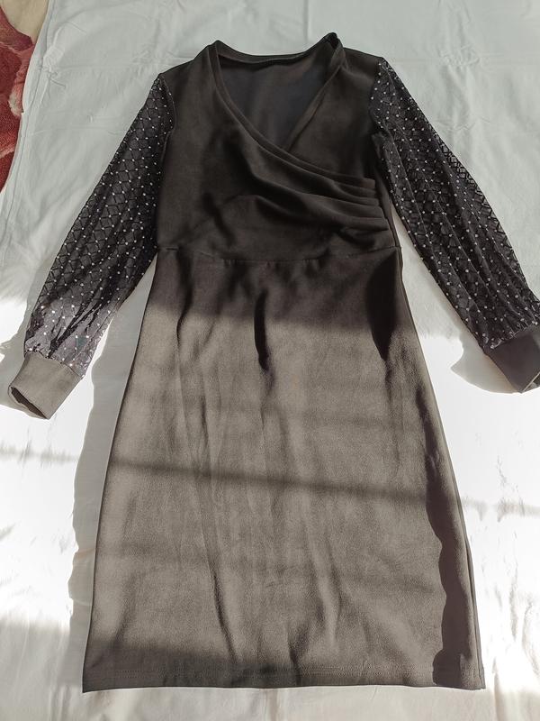 Платье красивое черное, ткань напоминает замш, тянется. Надевался пар раз. Все замеры на фото. По дополнительной информации воспользуйтесь приватом