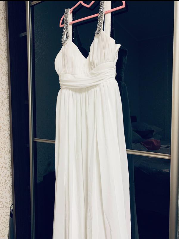 Сукня одягнена один раз, весь декор на місці. Без дефектів. Розмір М. Збоку блискавка. Шлейки дуже гарні та блискучі, блиск не втратили. Шифон гарної якості. Заміри у вільному стані, сукня застібнена. Довжина зі шлейкою 151 см Довжина від лінії (яка під грудами) 122 см Сукня одягалася на розмір грудей 75В. Ширина (груди) 38 см Ширина (лінія під грудами) 32 см