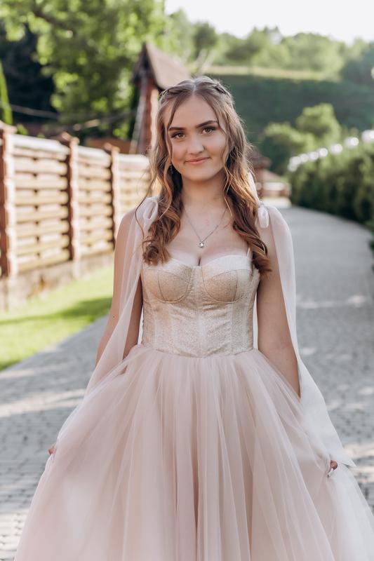 Платье корсетом, на фото рост 167-168, длина миди, на спинке регулируется завязками, подойти на размер S-M. Было одето один раз на выпускной, приобрела в салоне за 7000