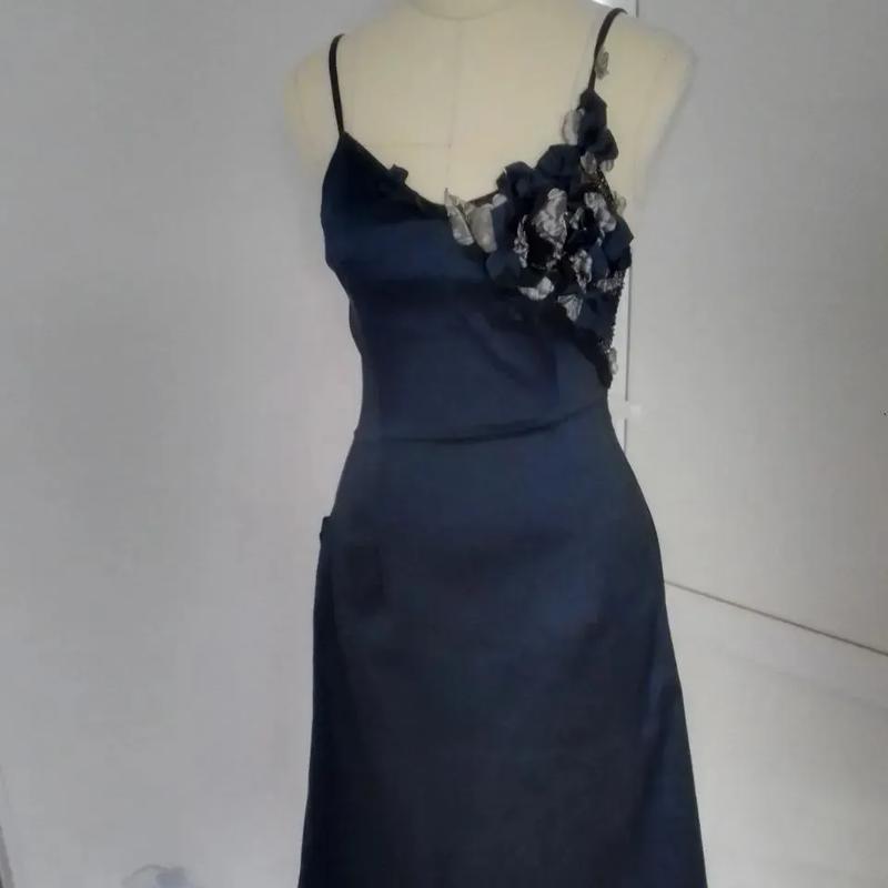Елегантное платье в синем цвете украшено цветами ручной работы и вышитым бисером