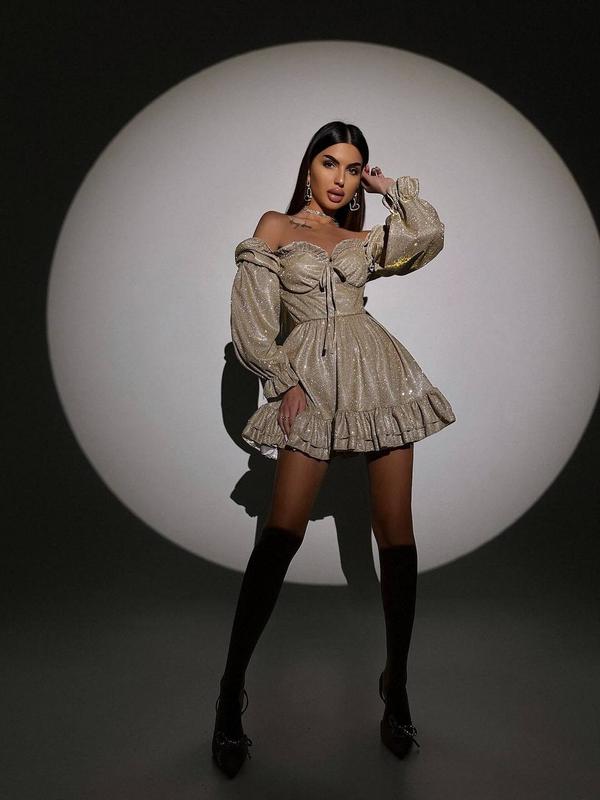 Блестящее платье с чашечками и пышной юбкой Тканина: люрекс Размер: S и М ( L + 200 грн) Уход: ручная стирка до 30° Производство: Украин