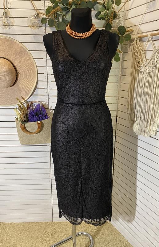 Вечернее платье футляр, от бренда Oasis, выполненное из кружева в очень красивом цвете (черный с бронзовым напылением) очень красиво садится по фигуре, подчеркивая ее достоинства. Платье имеет v-образный вырез из переда и сзади, длина миди. Сзади закрывается на молнию и расположена распиха. Платье имеет подкладку, поэтому просвечиваться не будет Состояние - идеальный Размер - S Обхват грудей - 80 см. Обхват талии - 66 см. Обхват стегон - 82 см. Длина от плеча - 114 см.