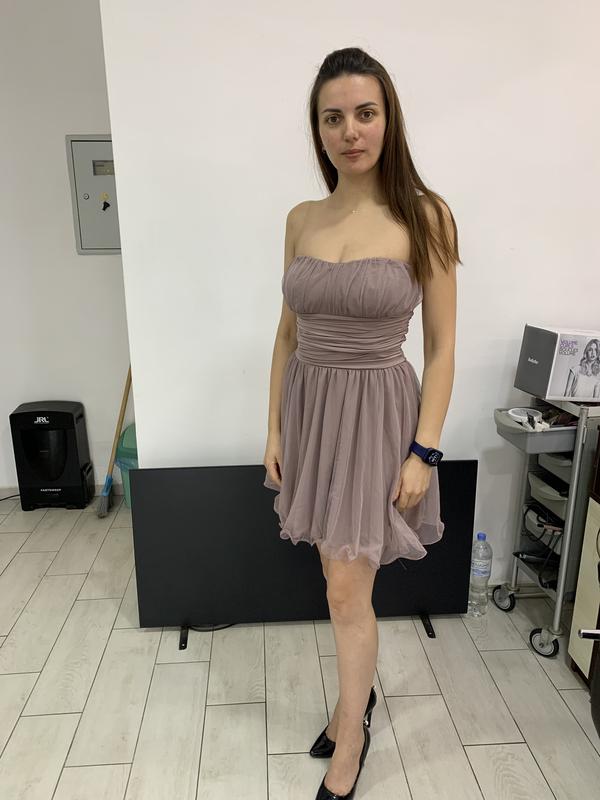 Короткое платье из фатина. Сверху есть силиконовая полоска, чтобы платье держалось на теле. Снизу есть лезвия для объема фатина. На талии ткань собрана, немного тянется. Есть подкладка. Надевала 1 раз на свадьбу Замеры: Полуобхват груди - 37 см Полу обхват талии - 31 см Длина - 70 см