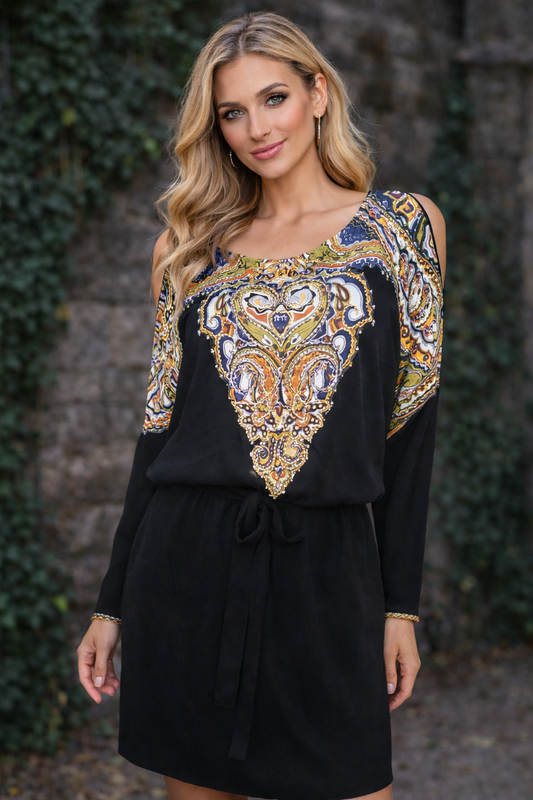 Очень красивое платье. Украшен камушками и паетками. Рукачик летучаяя мышка. Есть трикотажная, типа атлсно подкладка. Само платье висоза, не тянется. Плечики открыты. На одном рукачике отсуствует декор. Показала на последнем фото. ОГ 84-92 см ОТ 70-80 см ОБ 100 см Длина 94 см