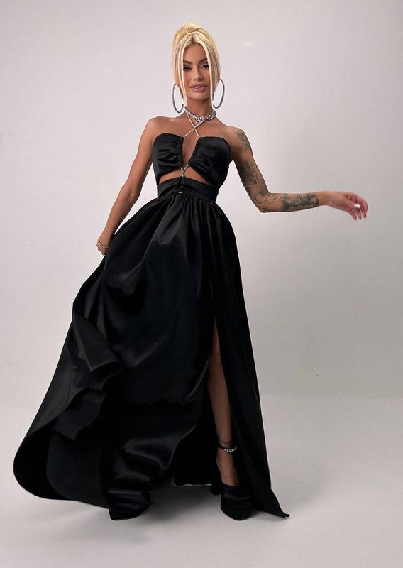 Атласное вечернее платье макси со шнурком со стразами, атласное длинное платье с разрезом...