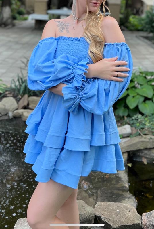 Шикарна сукня з пишною юбкою . Одягнута була 1 раз , без дефектів. Колір ніжно голубий. Тканина 100% льон . Розмір S але підійде і на М