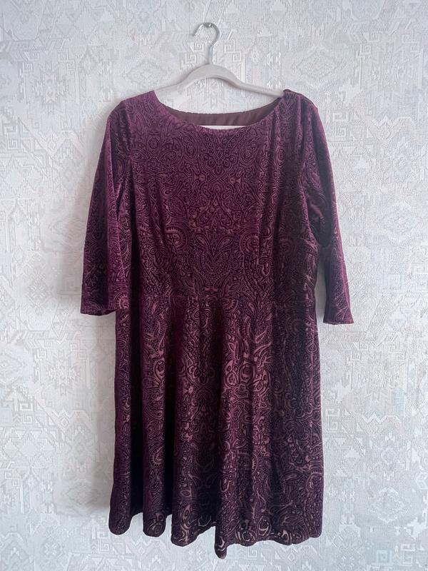 Сукня середньої довжин. Фірма M&S (розмір по бірці 20), без застібки. Оксамитова тканина на сітці та з підкладом. Колір марсело західний принт. З рукавом три чверті. Фасон відрізний на талії, юбка напівсонце. Тканина дуже красива та мʼяка. Заміри: ОГ 114-128 ОТ 100-110 ОБ до 126 Доужинал сукні 94