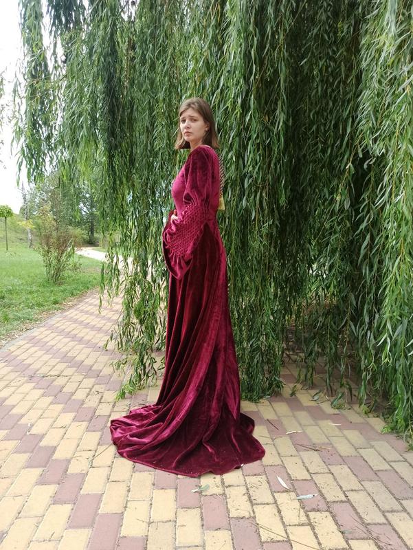 Вечернее платье, шитое под заказ. Одето один раз на мероприятие. Ткань, велюр винного цвета. На рукавах вышиты буфы, платье с цельнокроеные шлейфом. На рост от 175 +11 см туфли. Обхват груди от 95, обхват талии 76.