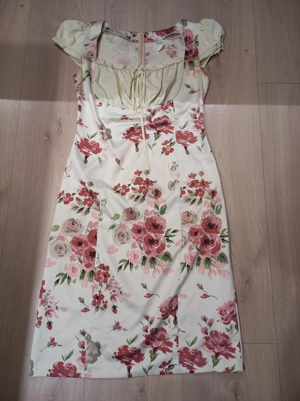 Платье очень красивое в красивые цветы, спереди подчеркивает грудь, застегивается по заду на молнию,меет сзади разрез.Стан великолепен. Ог 47, от 40,об 48.дожина 100 Тягнеться