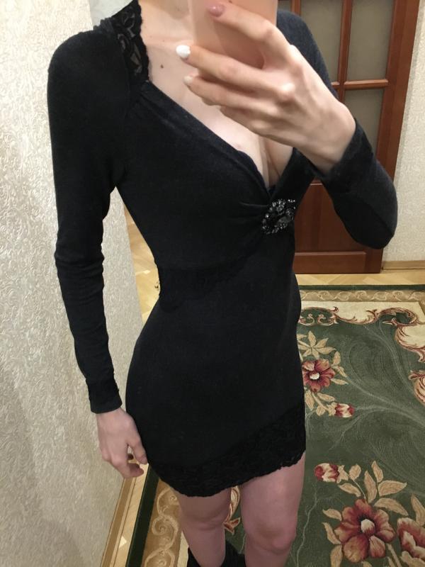 Шикарное сексуальное вечернее платье с красивой брошью в камнях на груди. Цвет темно серый, отделка снизу и ра кукавах чёрным ажуром и спинка чёрная сетка. Мягкий котон идеально ложится по фигуре. Страна - Италия. Размер - М.