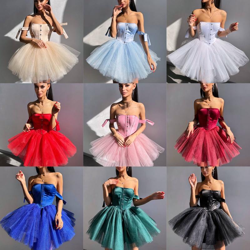 Атласное корсетное платье мини с крючками и пышной фатиновой юбкой ▫️тканина: атлас , фатин ▫️размер: S и М ( L + 300 грн)