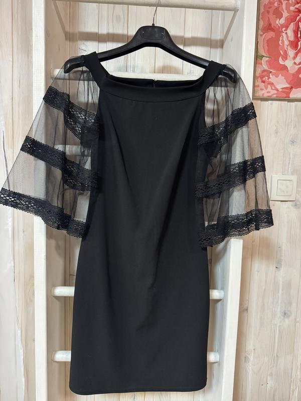 Черное платье с красивым рукавами, украшенные кружевом и сеткой. Размер 44, длина 90см. Есть дефект на замочке на спине. Какой легко исправить.