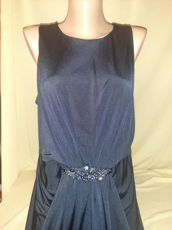 Темно- синее платье, застежка на молнии и пуговицу сзади, сборки очень файно корегируют фигуру, идет на М/L :ПОГ - 55см, ПОТ - 43/50 см за счет резинки, ПОБ - до 57см, есть подкладка от талии, длина - 109см