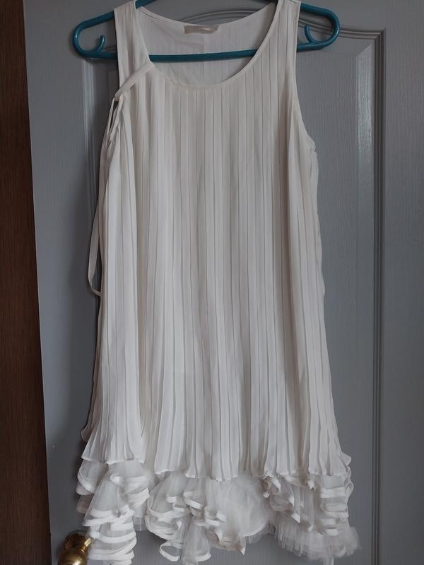 Сукня дуже гарна, молочного кольору, плиссе и красивыми аборками и тонким поском, можно носить и без него, форма трапеции. Замеры по запросу. Смотрите другие мои обьявления, много хороших вещей.
