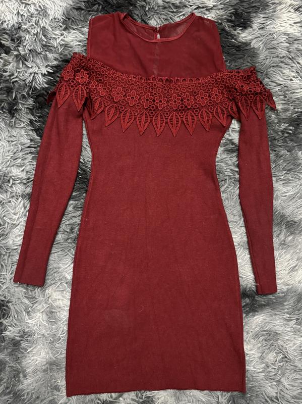 Красива вʼязана бордова сукня, верх поєднання мережива та сітки, відкриті плечі, розмір 42-46, добре тягнеться, без дефектів, єдине що позаду ґудзик загубився маленький, треба любий пришити, приємна та мʼяка до тіла