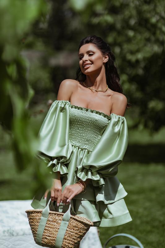 Атласное платье с пышной юбкой и объемными рукавами, атласное платье с резинкой на груди,...