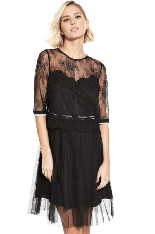 Модное вечернее платье Guess с юбкой-плотимой. Свободная верхняя часть боди из романтичного кружева. Для застегивания используются пуговицы на спине и молния на боковом шве. Рукава 3/4 с узкими манжетами. ✨ Состояние: идеальный без дефектов ✨ЗАМЕРЫ: длина по спинке 92 см., плечи 36 ПОГ 42-44см., пот 34, пос 48 рукава 35 ✨ Состав: 100% полиэстер, Материал 2: 65% хлопок 25% полиамид 10% полиэстер. Подкладка: 100% полиэстер