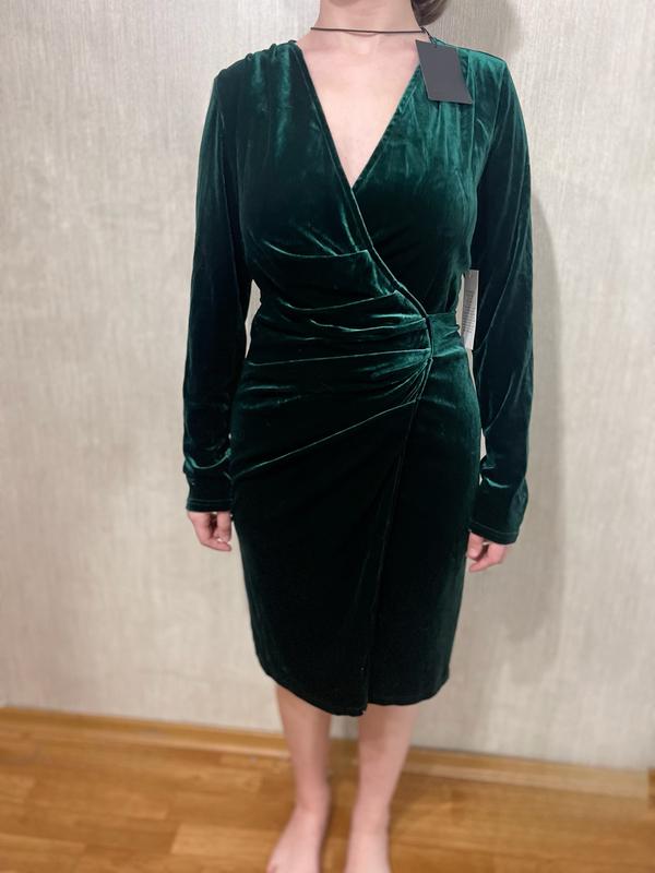 Елегантна темно-зелена сукня на запах із м’якого поліестеру з ефектом бархату. Має підкладку — не просвічує, комфортна до тіла. Зав’язується на талії — можна регулювати посадку. Глибокий V-виріз красиво підкреслює декольте. Розмір: орієнтовно M Матеріал: поліестер, виглядає як оксамит Стан: нова, з біркою Заміри: • Довжина — 100 см • Ширина по плечах — 40 см • Напівобхват грудей — 45 см • Довжина рукава від плеча — 63 см • Довжина рукава від пахви — 49 см • Талія регулюється зав’язками