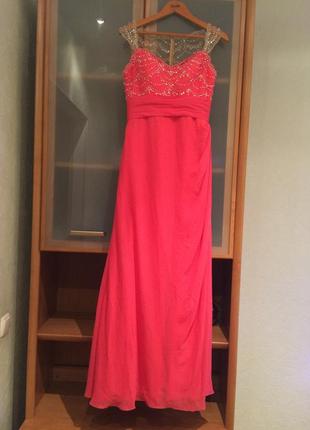 Шикарне вечірнє плаття, тканина шифон, є підкладка, дуже красива вишивка ( стрази, паєтки,перли), сітка під колір тіла, створюється враження, що камінці розсипані по тілу, ліф поддержующий груди. Довжина 149 см,ширина по грудях 44 см, ширина по талії 36 див. Плаття супер красиве!!!