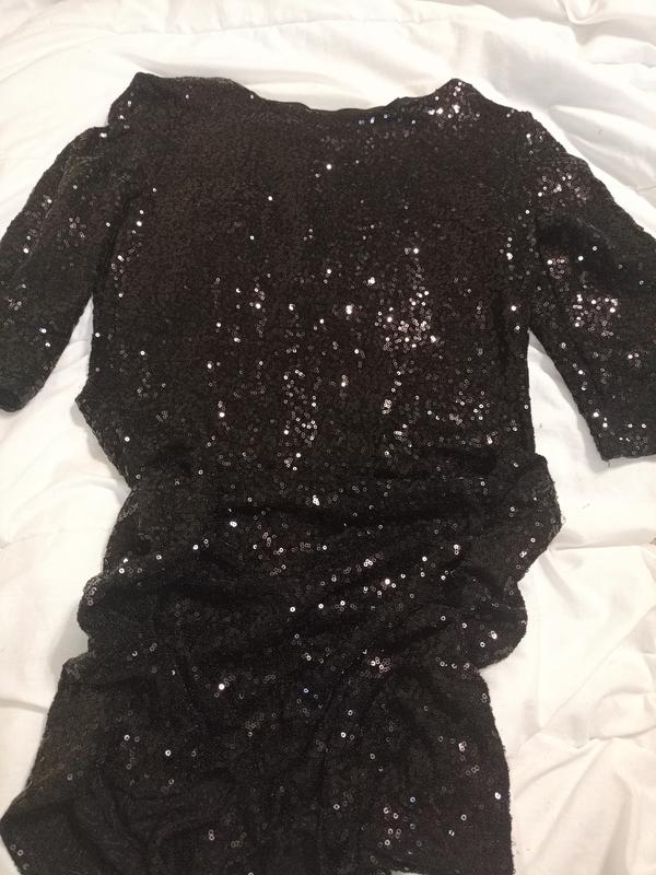 совершенно новая,так ни разу и не одевала. платье с пайетками, красиво переливается. рукава до локтей. сама длиной чуть выше колен