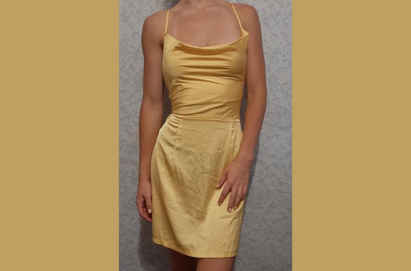 Платье атласное, желтое, на завязках и маленькой молнии сзади. на этикетке пишет 38 размер. по дополнительной информации — пишите