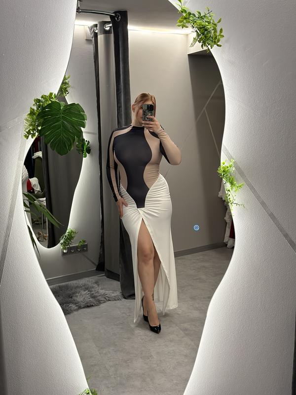 Платье с закрытым верхом, бежевый цвет имитирует кожу. Ткань эластичная. Параметры на фото: рост 168 см, 110/77/106. Рекомендую брать на параметры не пару см меньше.