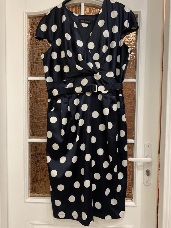 Нарядне плаття атласне темно-синє в білий горох, нижче коліна, з твердим поясом, розмір 50, талія 46, довжина виробу 110 см, від таліі- 65, драпірування на грудях, низ- олівець, з кишенями, ширина по низу/ 55 см, зліва блискавка
