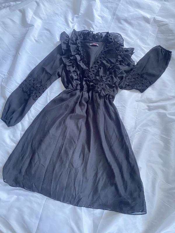 Сукня чорна, з плотного шифону з перфорацією, з глибоким декольте, довгим рукавом; на підкладці, талія на резинці. Розмір М ПОГ 43см ПОТ 30см (в розтягнутому вигляді-43см) Довжина 82см. Довжина рукава 53см.