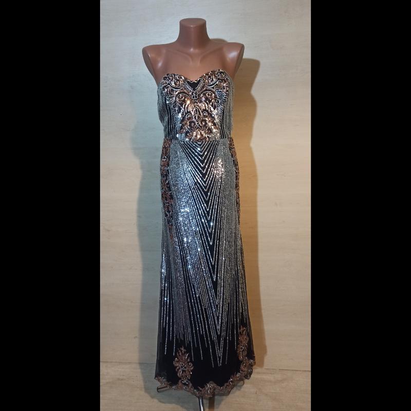 Длинное блестящее черное платье в золотистые и серебристые пайетки (корсет). Платье на подкладке, приталенная, на спинке молния.Пог 40 см,Пот 35 см, ПОБиды 42 см, длина платья: по спинке 124 см, по переду 122 см, без рукавов.