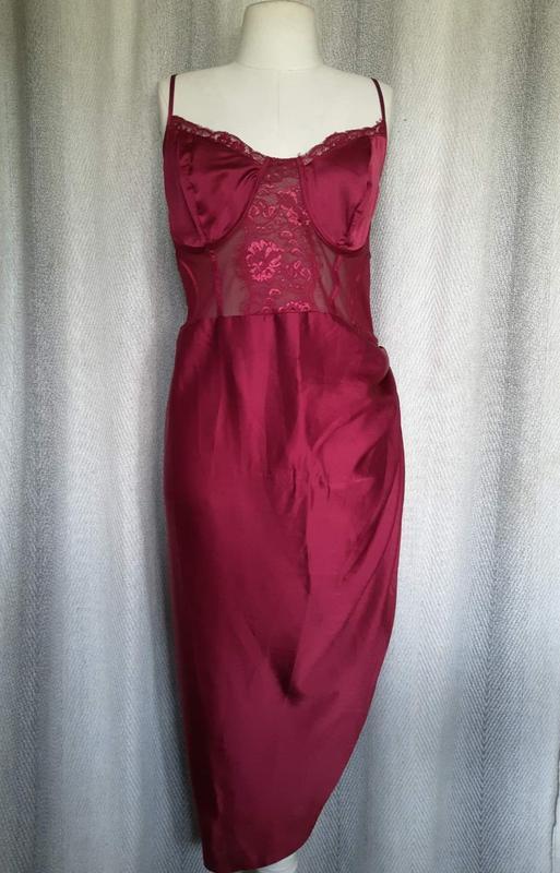 Атласное миди платье в бельевом стиле Бордовое платье, платье-комбинация в одном размере 18, наш 52-54 возможно маломерит. ориентируемся по замерам замеры: полу охват груди 45-50 см, под грудью 42, пояс 45 см, бедра около 55 см, длина от плеча 129 см, верх 39, низ по боковым швам 90/44см длина рукава верх тянется, сбоку молния, возврата нет, безопасной и наложкой не отправляю.Материал очень тонкий атлас Чашечка тонка без паралону На хорошую пропорциональную фигуру хоть и полную На фигуру груша последние три фото этого платья в черном цвете на модели.