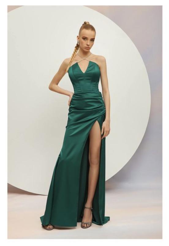Параметри : Ріст - 152 + шлейф 13 см| Ог - 82 | От - 62 | Об - 88 Одягали один раз на випускний вечір. Тканина: Виконана зі стрейч-атласу, сукня на підкладці. Ліф сукні на внутрішніх кісточка та з чашками пуш-ап. Застібка по спинці на шнуровку та потайний замок до талії. Декоративна бретелька, що вишита вручну камінцями та кріпиться на кнопочки до сукні, яку при потребі можна зняти. Довжина по бічному шві від талії 119 см. Сукня з чашками, що розраховані до 42 розміру.