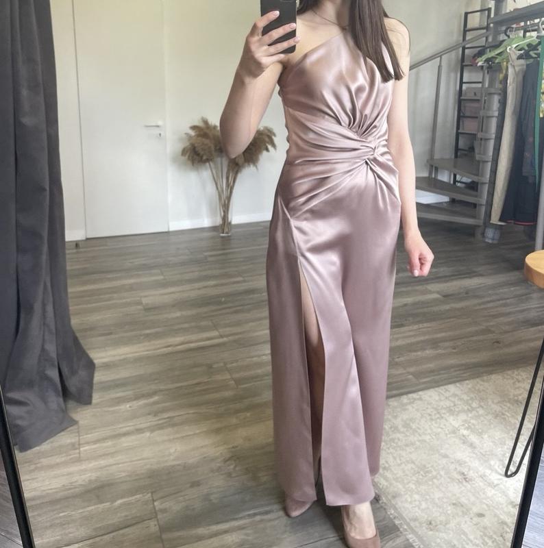 Продам вечірню сукню ніжно-рожевого відтінку. Шита на замовлення для подружки нареченої, але так і не була одягнена — лише одна примірка. Тканина атласна дорога, з красивим блиском, фасон на одне плече, акцентна драпіровка на талії та високий розріз збоку. Розмір: S Стан: нова, після примірки, без дефектів. Зацікавленим можу надати точні заміри. Сукня ідеально підійде для весілля, вечірки чи іншого урочистого заходу.