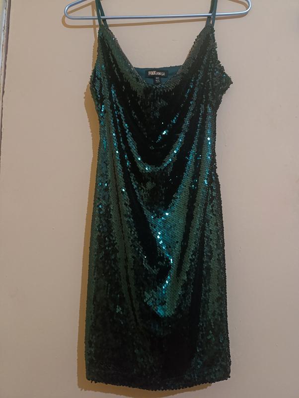 UK12 EU40 US8 Эффектное вечернее платье с пайетками ✨ Цвет – насыщенный изумрудный, красиво сияет при свете. Есть подкладка. Фасон мини, на тонких бретельках, с открытой спиной и мягким драпированным вырезом. Ткань полностью расшита пайетками, которые красиво переливаются и создают праздничный образ. Идеальный вариант для вечеринки, празднования или Нового года. Состояние - отличный, одевалась всего несколько раз. Параметры девушки на фото: Груди 87 Талия 68 Бедра 98 Рост 170