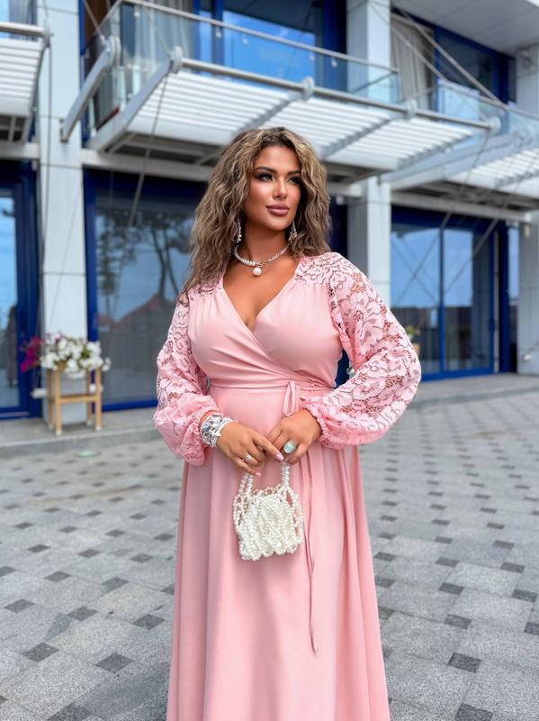 Женское вечернее нарядное праздничное длинное платье с длинным рукавом из кружева розовая...