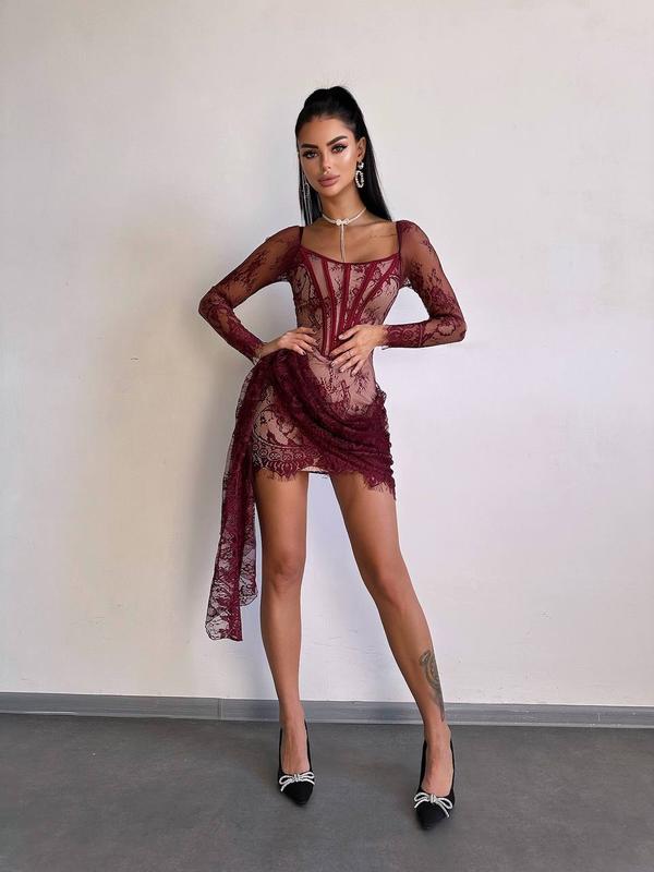 ‼️Платье под пошив, ожидать 3-7 рабочих дней!️ *Актуальные сроки отправки уточняйте у менеджера в чате перед заказом Кружевное платье мини со шлейфом 8 цветов ▫️ткань: кружево, трикотажная подкладка ▫️размеры: S и М (L +250 грн)