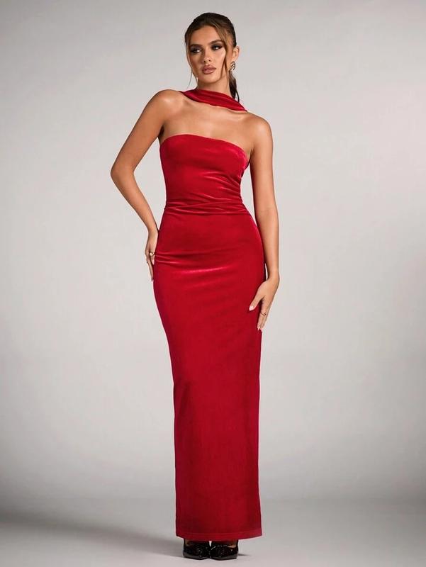 Червона сукня жіноча вечірня велюрова новорічна максі міді з декольте та відкритою спинкою...