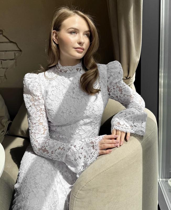 Біла мереживна сукня у вінтажному стилі 🌿 Довгий рукав, високий комір та витончене мереживо по всій довжині. Ідеальний варіант для фотосесії, нареченої чи особливої події 🤍 Розмір — S/M. довжина 135 см. Стан — нова.