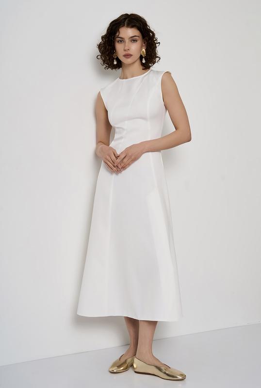 Повність нова сукня. Не підійшла по розміру. Сукня міді молочного кольору. Виконана із італійської віскози. Дизайнерський крій, рельєфні лінії, по всій довжині сукні. Приталена і ідеально повторює лінії тіла. Розширена донизу і має кокетливий розріз з лівої сторони. Виріз горловини - човник. На спинці розташована прихована застібка блискавка і гудзик. Легка, зручна та оригінальна сукня - чудовий образ для різних подій і гарного настрою. Параметри моделі на фото: зріст-170 см, Ог-82см От-61см Об-91см. Сукня на моделі у розмірі XS