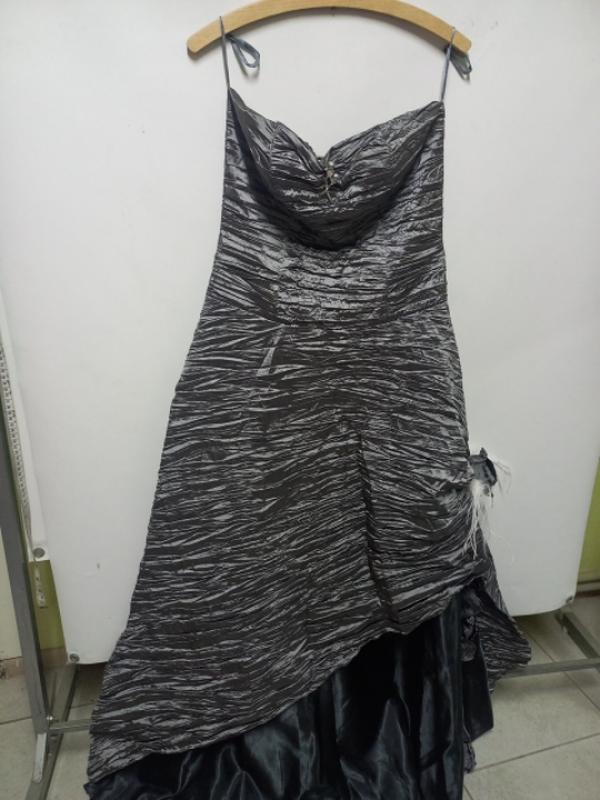 длинное нарядное вечернее платье бьютиеет,серого,стольного цвета, тканая жатый шелк,ассеметрический подол украшен перьями,сзади шнуровка и молния,талия до 74,груды 92см