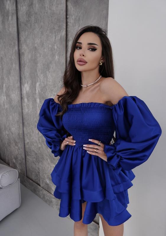 Атласное платье с пышной юбкой и объемными рукавами синяя, атласное платье с резинкой на г...
